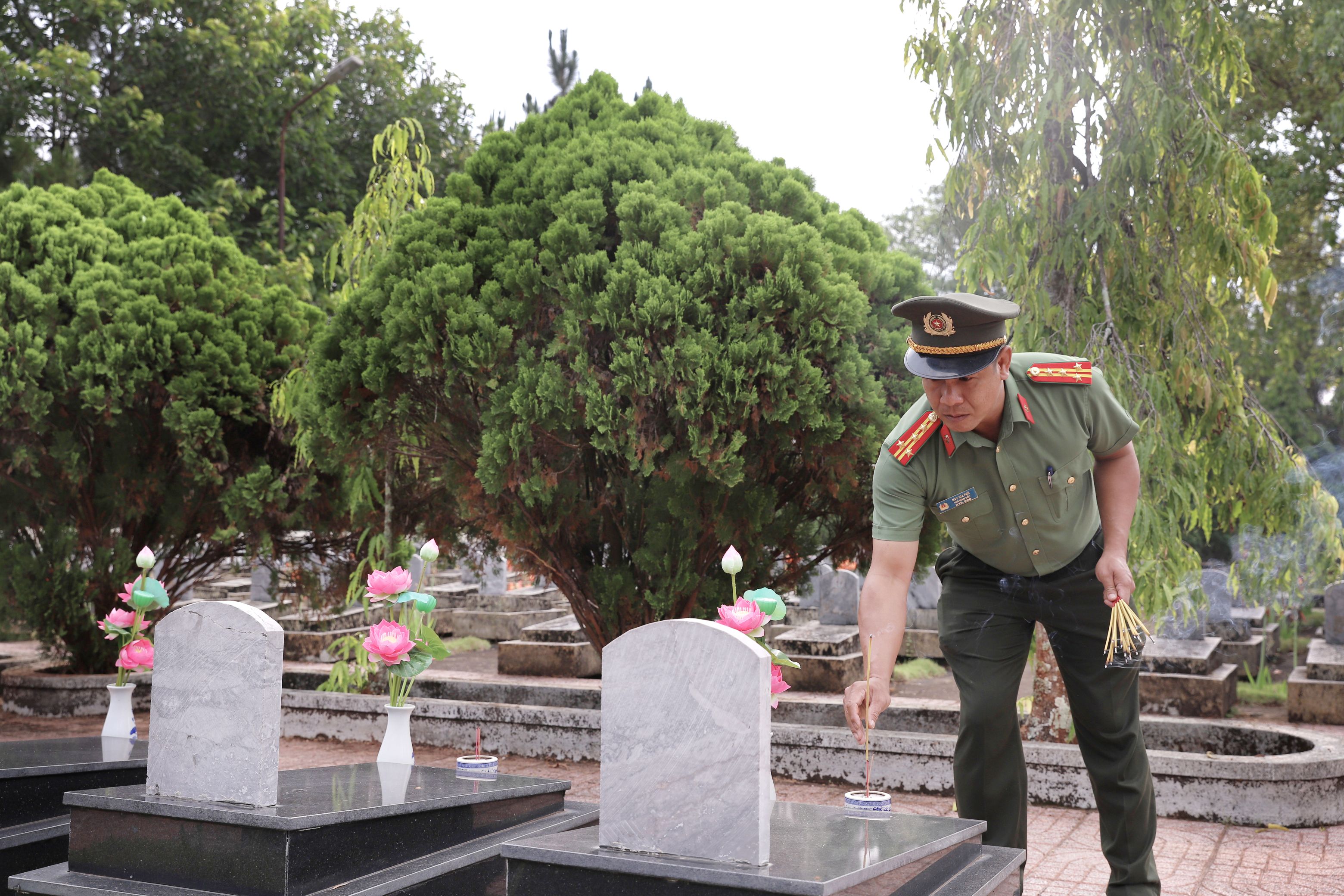 Đại tá Nay Gia Phú, Phó Giám đốc Công an tỉnh thắp nén hương thơm cho các liệt sỹ