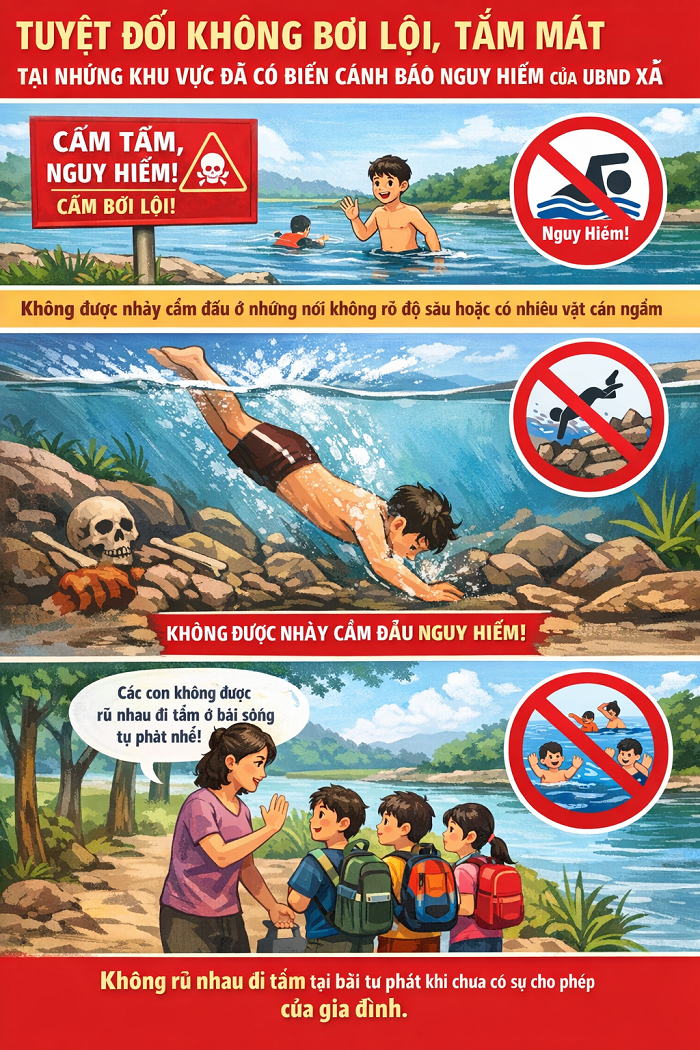 2. Đối với thanh thiếu niên, học sinh, cần tuyệt đối không bơi lội tại các khu vực nguy hiểm, khu vực đã lắp đặt biển cảnh báo; đồng thời chủ động trang bị kỹ năng xử lý tình huống khi gặp sự cố đuối nước.