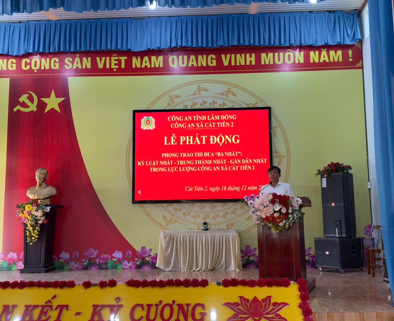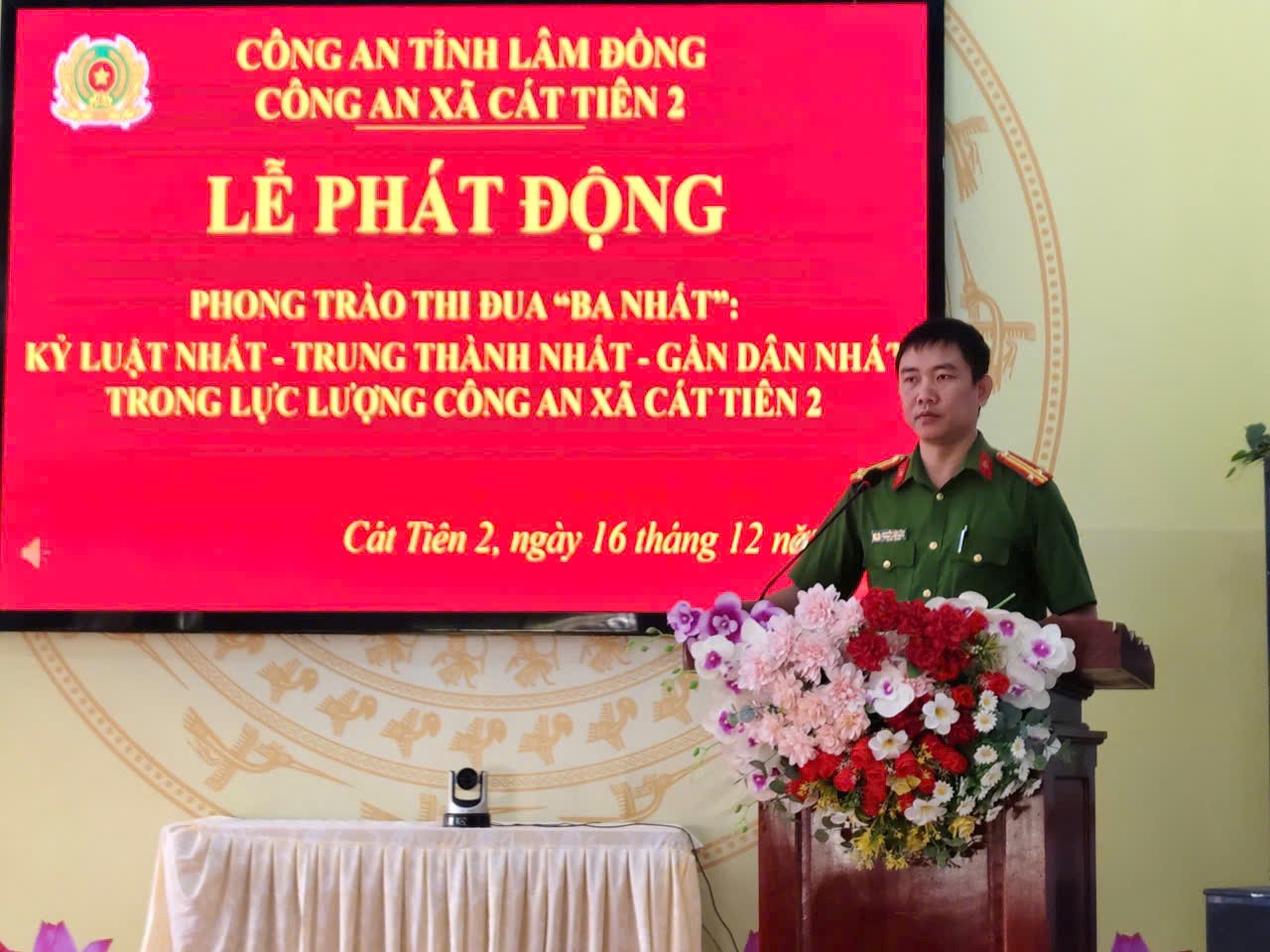 Phát biểu chỉ đạo tại buổi lễ, đồng chí Chủ tịch UBND xã nhấn mạnh vai trò, trách nhiệm của lực lượng Công an xã trong việc triển khai hiệu quả phong trào thi đua; đồng thời bày tỏ tin tưởng rằng với tinh thần đoàn kết, trách nhiệm và quyết tâm chính trị cao, Công an xã Cát Tiên 2 sẽ tạo chuyển biến rõ nét về kỷ luật, tác phong, chất lượng công tác và mối quan hệ gắn bó mật thiết với Nhân dân.