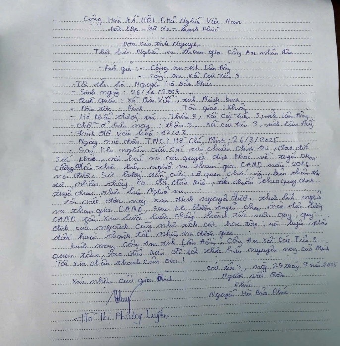 Từ ngày 08/8/2025 đến nay, nhiều công dân đã đến trụ sở Công an xã để đăng ký tham gia nghĩa vụ Công an nhân dân năm 2026, trong đó có em Nguyễn Hà Bảo Phúc (SN 2007), thường trú tại thôn 3, xã Cát Tiên 3, tỉnh Lâm Đồng. Là một thanh niên trẻ có ý thức, em Phúc nhận thức rõ trách nhiệm của bản thân đối với Tổ quốc, với khát vọng được rèn luyện trong môi trường kỷ luật, được cống hiến sức trẻ cho đất nước, em đã chủ động viết đơn tự nguyện tham gia nghĩa vụ Công an nhân dân.