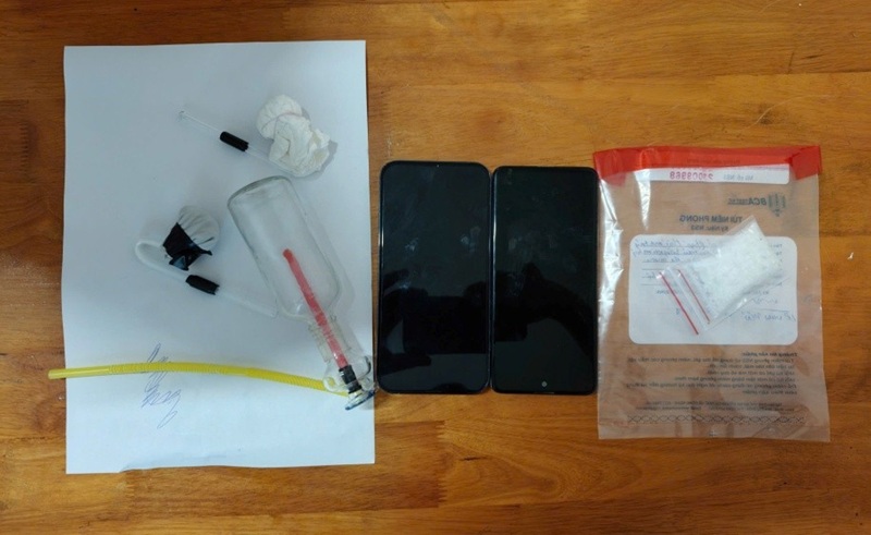 Quá trình kiểm tra, lực lượng Công an phát hiện trên người Võ Phạm Hùng có 01 gói nylon trong suốt chứa chất tinh thể rắn màu trắng, nghi là ma túy đá, trọng lượng khoảng 10g và 02 điện thoại di động.