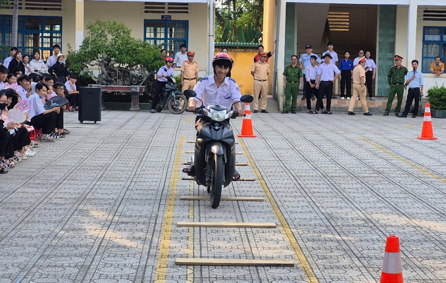Bên cạnh đó, học sinh được hướng dẫn kỹ năng điều khiển xe gắn máy an toàn như kiểm tra phương tiện, tư thế lái xe, cách sử dụng phanh, ga, chuyển số, xử lý tình huống nguy hiểm; thực hành các bài lái xe cơ bản như đi hình số 8, đi qua vật cản, đường gồ ghề.