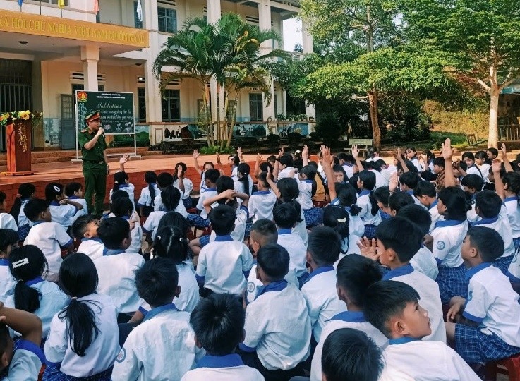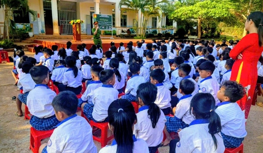 Tại buổi tuyên truyền, báo cáo viên Công an xã Đắk Mil đã truyền đạt các kiến thức pháp luật và kỹ năng sống thiết thực, phù hợp với tâm lý lứa tuổi học sinh tiểu học.