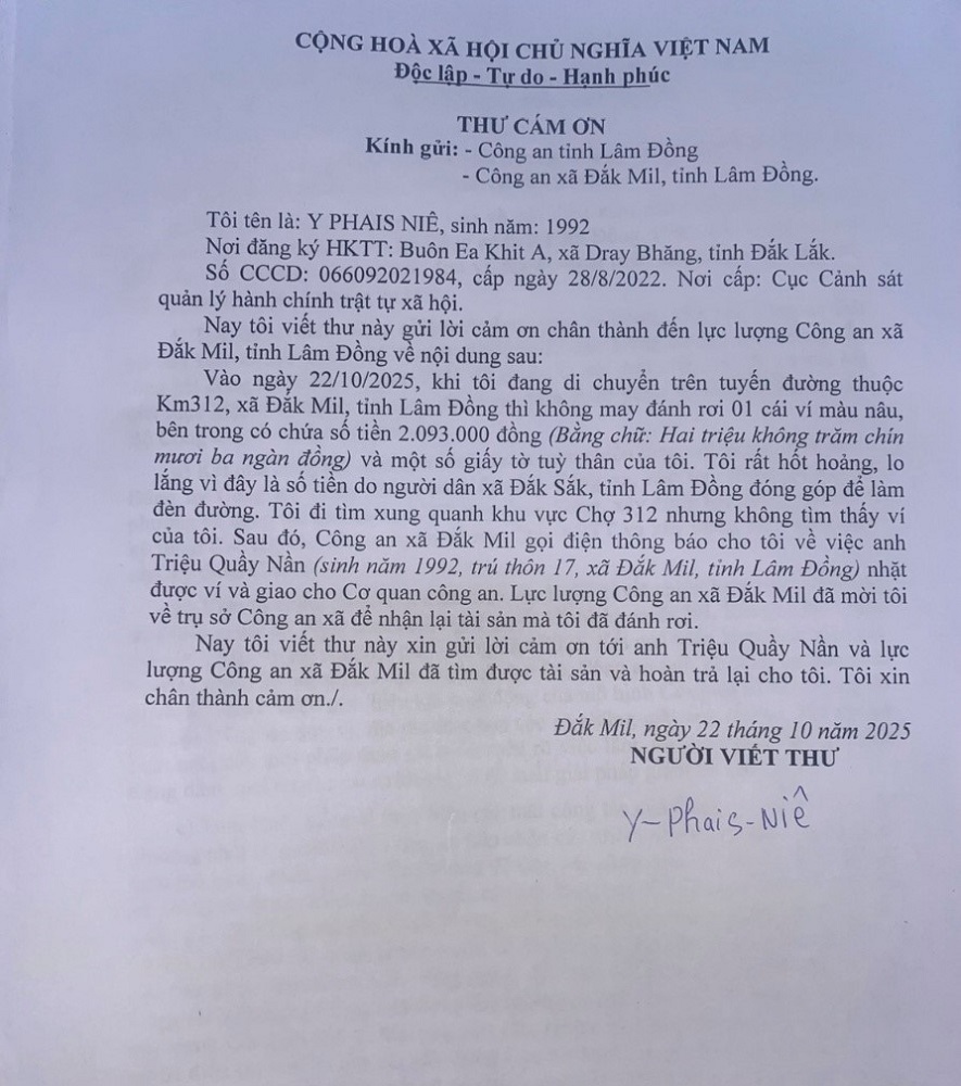 Nhận lại tài sản, anh Y Phais Niê xúc động gửi thư cảm ơn đến lực lượng Công an xã Đắk Mil vì tinh thần trách nhiệm, hết lòng vì Nhân dân phục vụ; đồng thời bày tỏ sự trân trọng trước nghĩa cử cao đẹp, trung thực của anh Triệu Quầy Nần.