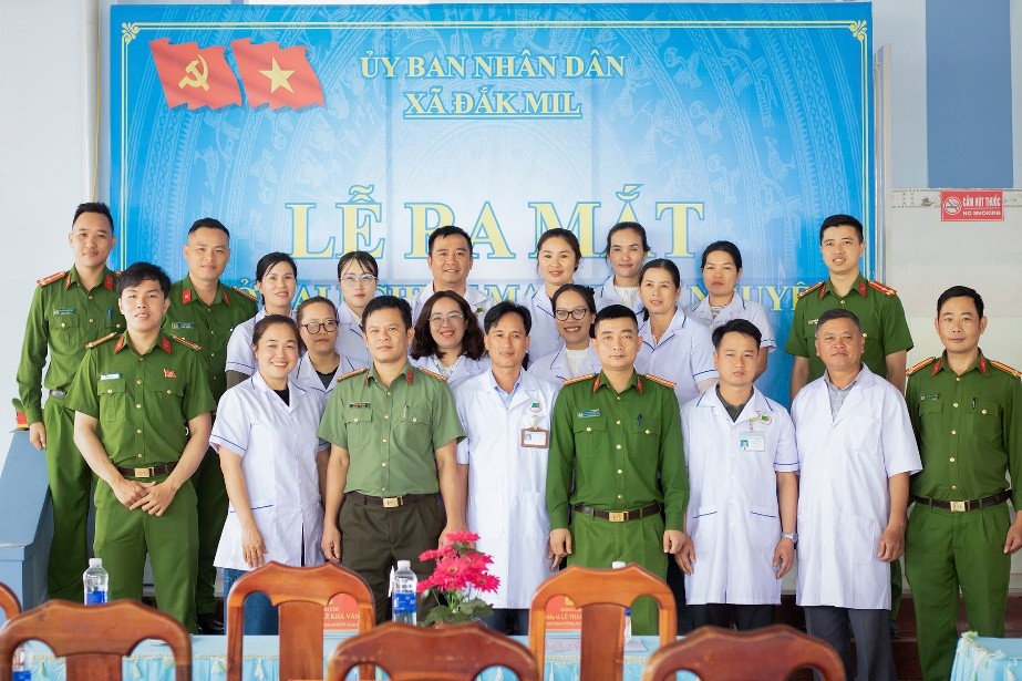Tập thể cán bộ, chiến sĩ Công an xã Đắk Mil chụp hình lưu niệm cùng cán bộ, nhân viên Trạm y tế xã Đắk Mil