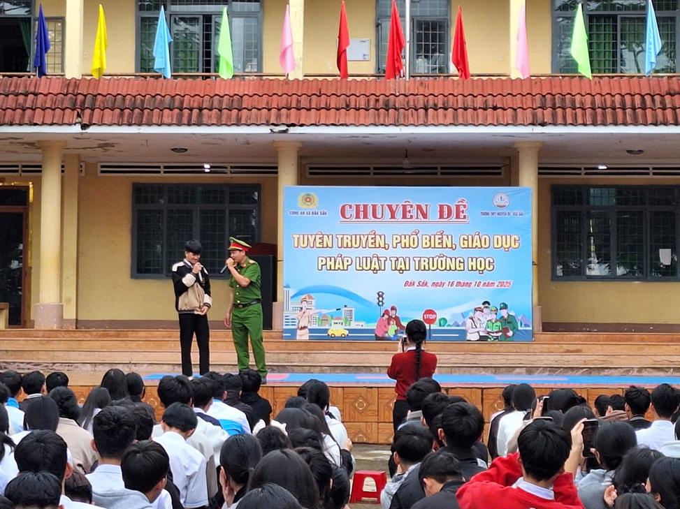 Hưởng ứng Tháng an toàn giao thông và hướng tới mục tiêu xây dựng địa bàn “Không ma túy”, từ ngày 22/9 đến ngày 29/10/2025, Công an xã Đắk Sắk đã phối hợp với các trường trung học cơ sở và trung học phổ thông trên địa bàn tổ chức nhiều buổi tuyên truyền, phổ biến pháp luật cho hơn 2.900 học sinh. Đây là hoạt động thiết thực nhằm nâng cao nhận thức, bồi dưỡng ý thức chấp hành pháp luật, góp phần xây dựng môi trường học đường an toàn, văn minh.