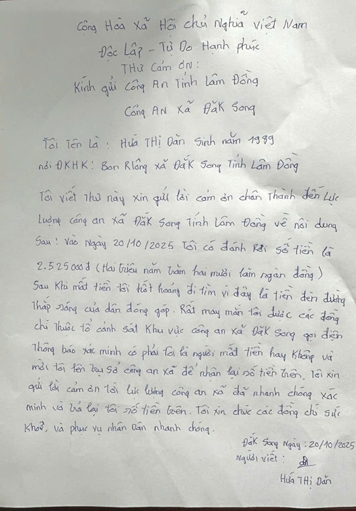 Nhận lại tài sản, chị Hứa Thị Dăn bày tỏ niềm vui mừng và xúc động, đồng thời gửi thư cảm ơn đến lực lượng Công an xã Đắk Song vì tinh thần trách nhiệm, tận tụy trong công việc. Chị cũng gửi lời cảm ơn chân thành đến anh Trần Hồng Quý vì nghĩa cử cao đẹp, trung thực và đáng trân trọng.