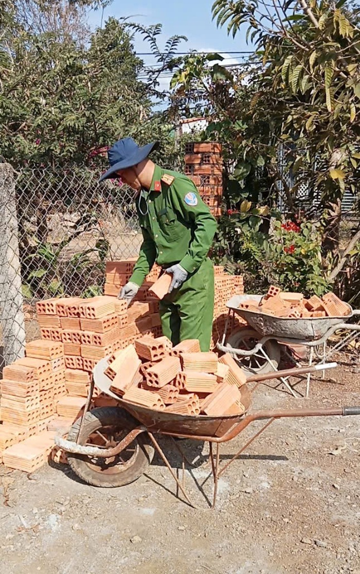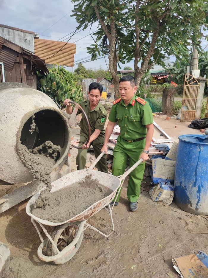 Cán bộ chiến sĩ Công an xã Đắk Wil cùng nhau hỗ trợ người dân xây dựng nhà