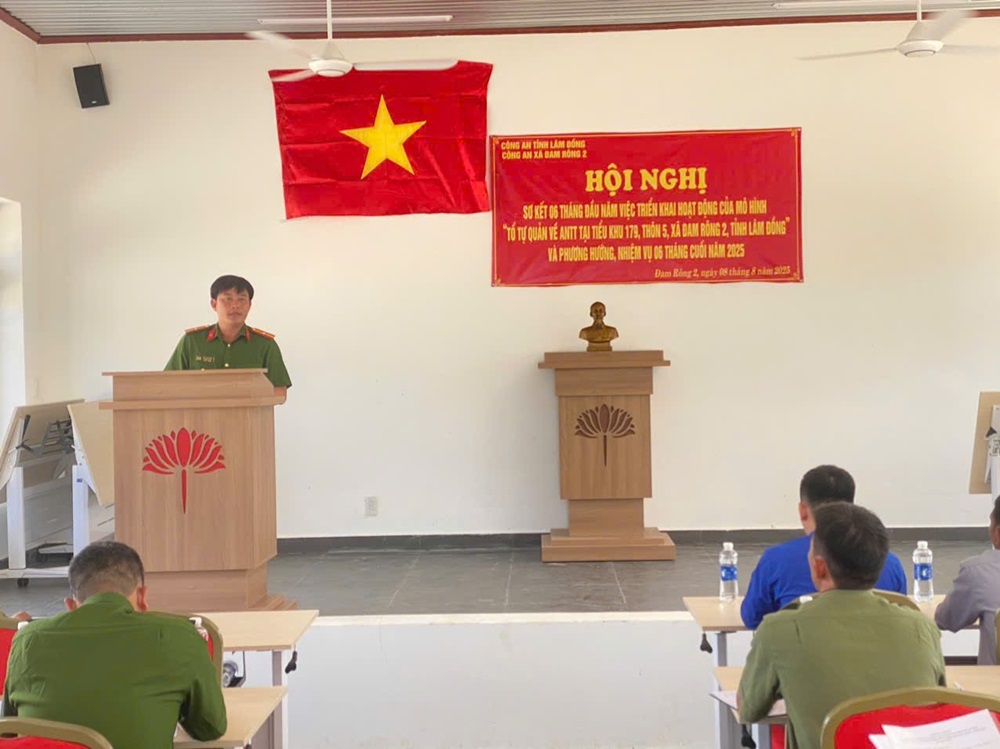 Phát biểu tại Hội nghị sơ kết 6 tháng đầu năm hoạt động của mô hình “Tổ tự quản về ANTT” tại tiểu khu 179, thôn 5, xã Đam Rông 2, tỉnh Lâm Đồng, đồng chí Trưởng Công an xã nhấn mạnh một số yêu cầu nhiệm vụ trong thời gian tiếp theo nhằm đưa Mô hình hoạt động ngày một hiệu quả, thu hút được đông đảo quần chúng nhân dân tự nguyện tham gia; đồng thời xây dựng các cá nhân, gương điển hình tiên tiến trong phong trào toàn dân bảo vệ an ninh Tổ quốc năm 2025.