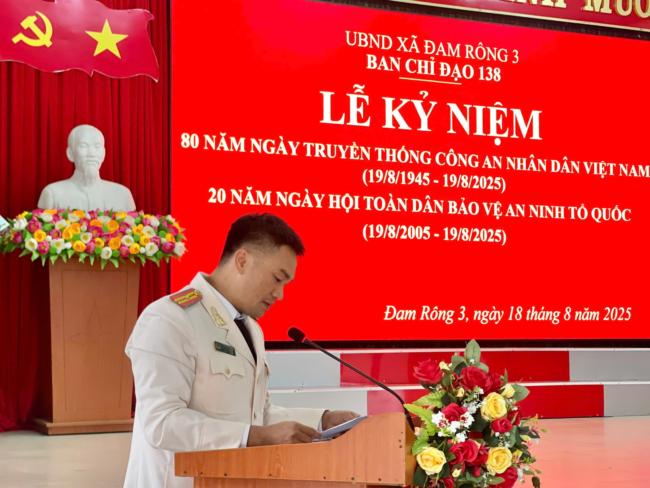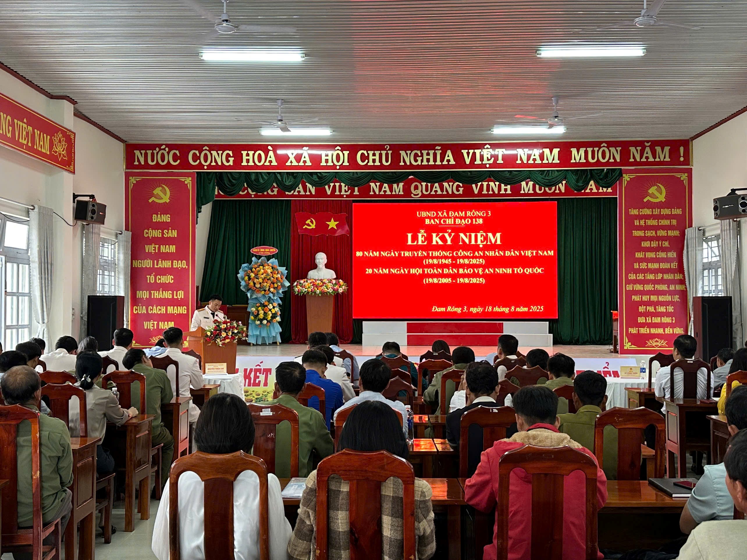 Trải qua 80 năm xây dựng, chiến đấu và trưởng thành, dưới sự lãnh đạo tuyệt đối, trực tiếp về mọi mặt của Đảng, sự giúp đỡ của nhân dân, Công an nhân dân Việt Nam nói chung và công an xã Đam Rông 3 nói riêng thực sự là “lá chắn thép” bảo vệ Đảng, Nhà nước và bình yên cho Nhân dân. 20 năm qua, Ngày hội toàn dân bảo vệ An ninh Tổ quốc đã trở thành hoạt động chính trị, xã hội sâu rộng, huy động sức mạnh tổng hợp của cả hệ thống chính trị và nhân dân trong công tác phòng chống tội phạm, tệ nạn xã hội, xây dựng đời sống văn hóa.