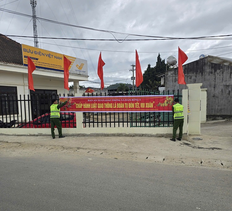 Lực lượng Công an xã Đam Rông treo băng rôn, khẩu hiệu tuyên truyền bảo đảm trật tự an toàn giao thông dịp Tết Nguyên đán trên địa bàn xã