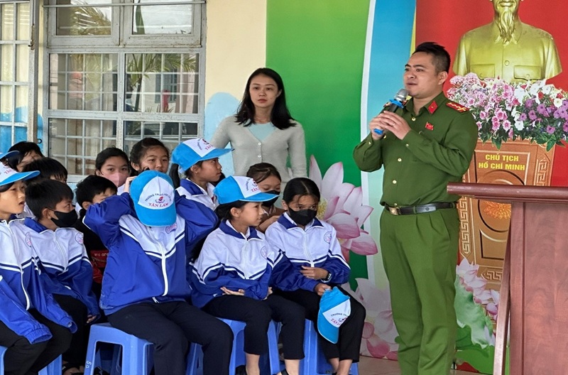 Công an xã tặng mũ bảo hiểm và cẩm nang tuyên truyền cho học sinh nhà trường
