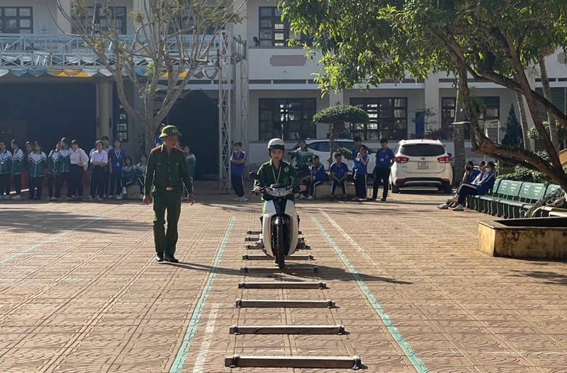 Bên cạnh việc trang bị kiến thức lý thuyết, các em học sinh còn được tham gia thực hành lái xe, chạy thử vòng số 8 và vượt chướng ngại vật ngay tại sân trường, mô phỏng nội dung sát hạch thực hành cấp giấy phép lái xe mô tô. Buổi tuyên truyền được tổ chức sinh động, trực quan, mang tính thực tiễn cao, qua đó giúp học sinh dễ dàng tiếp thu, ghi nhớ và nâng cao ý thức chấp hành pháp luật khi tham gia giao thông.