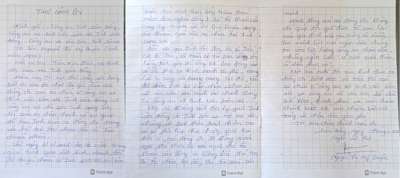 Thư cảm ơn của bà Nguyễn Thị Mỹ Duyên gửi đến Công an xã