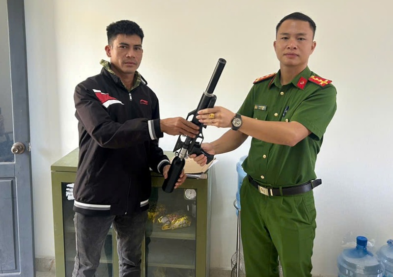 Công an xã tiếp nhận súng hơi tự chế của người dân tự nguyện giao nộp