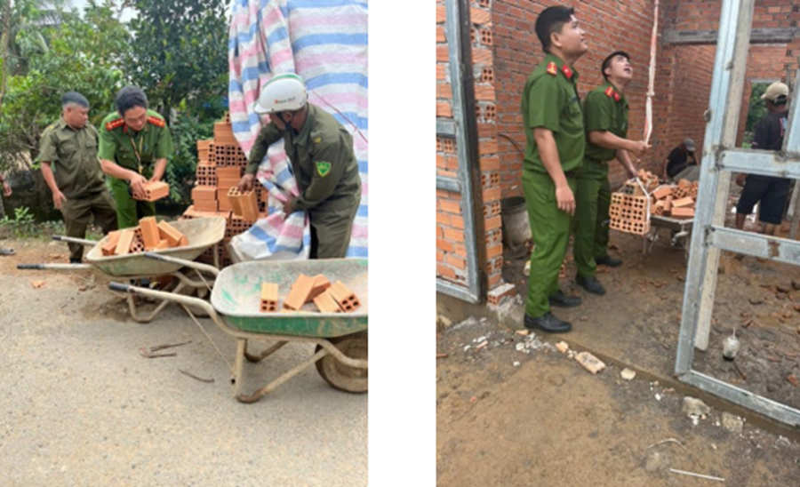 Lực lượng Công an xã hỗ trợ, giúp đỡ các hộ dân chị Thị Thỏa, anh Nguyễn Thành Trường ở thôn Đức Bình 4, xã Đồng Kho