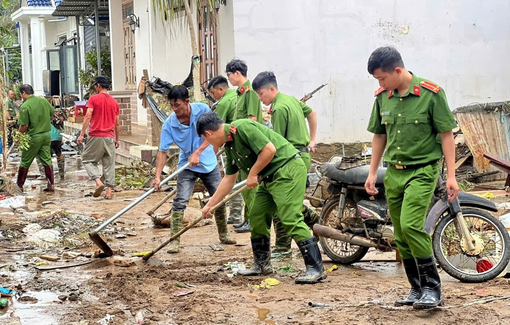 Lực lượng Công an xã xuống hỗ trợ người dân sau khi lũ rút