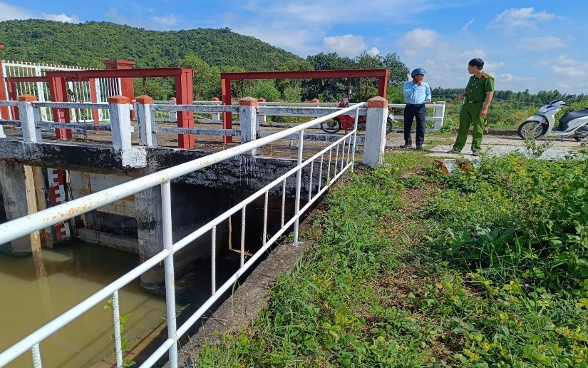 Công an xã phối hợp Công ty TNHH MTV Khai thác công trình Thủy lợi Bình Thuận khảo sát công trình hồ chứa nước Đu Đủ, thôn Phú Thọ, xã Hàm Kiệm