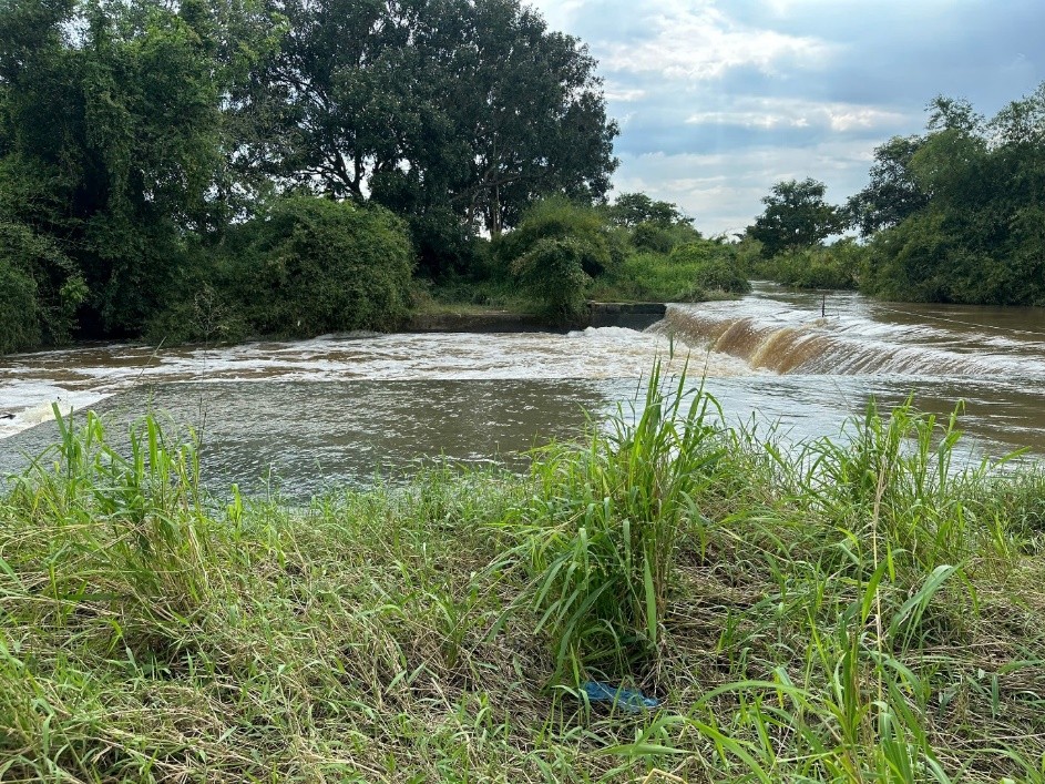 Nước lũ tràn về tại đập nước Đồng Đế, thôn Dân Phú, xã Hàm Kiệm