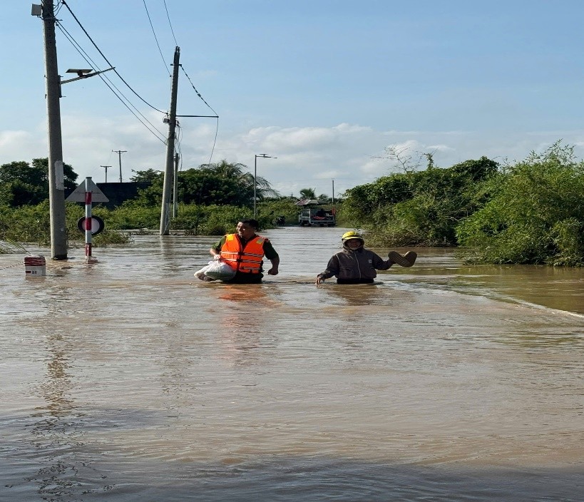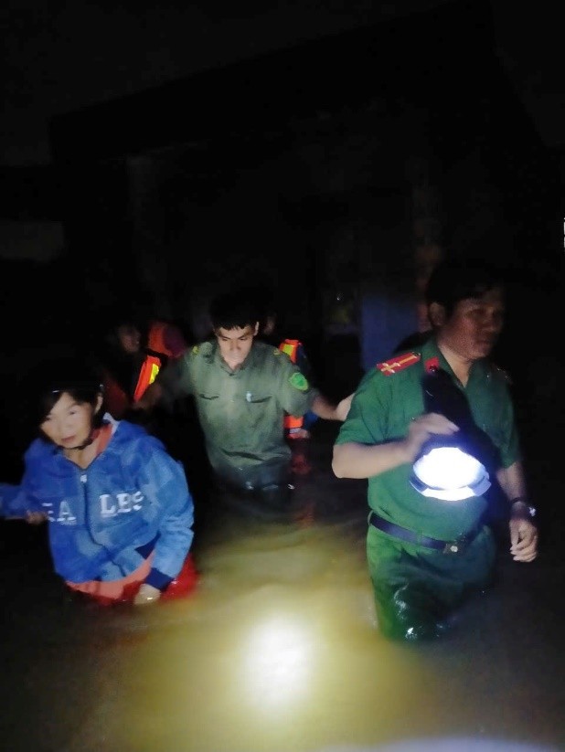 Công an xã phối hợp với BCH Quân sự xã và lực lượng bảo vệ ANTT hỗ trợ di dời tài sản, sơ tán bà con ra khỏi vùng nước lũ tại xã Hàm Kiệm do cơn bão số 13