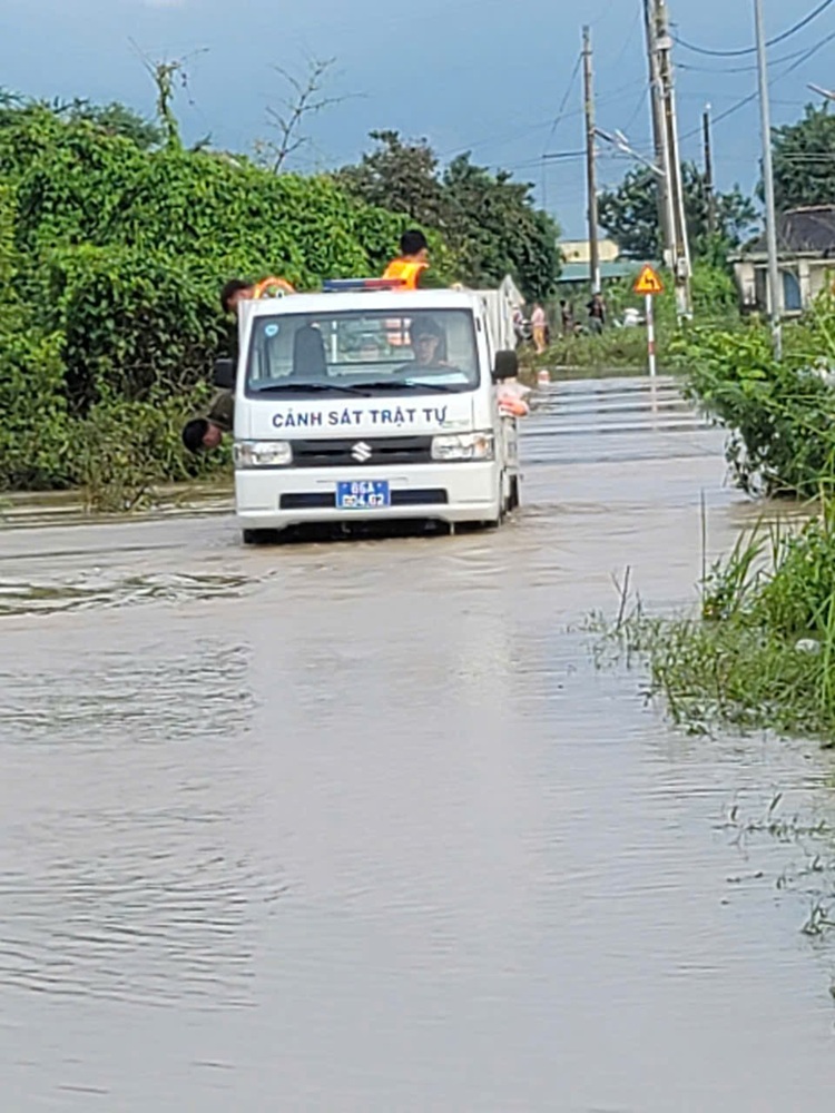 Công an xã dùng xe chuyên dụng tích cực hỗ trợ bà con bị ảnh hưởng bão lụt di chuyển ra khỏi các vùng lụt, ngập sâu, khắc phục hậu quả thiên tai, hết lòng phục vụ nhân dân