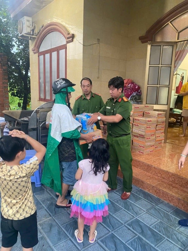 Công an xã phát nhu yếu phẩm hỗ trợ bà con bị ảnh hưởng bão, lụt trên địa bàn xã