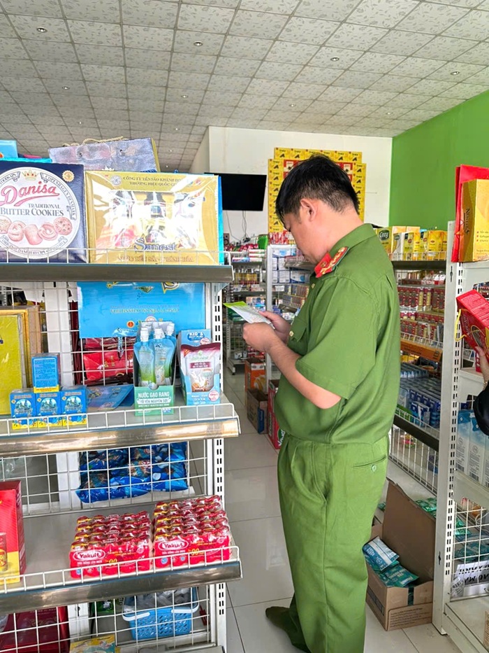 Cán bộ Công an xã Hàm Kiệm kiểm tra nhãn mác, hạn sử dụng của hàng hóa trong cửa hàng
