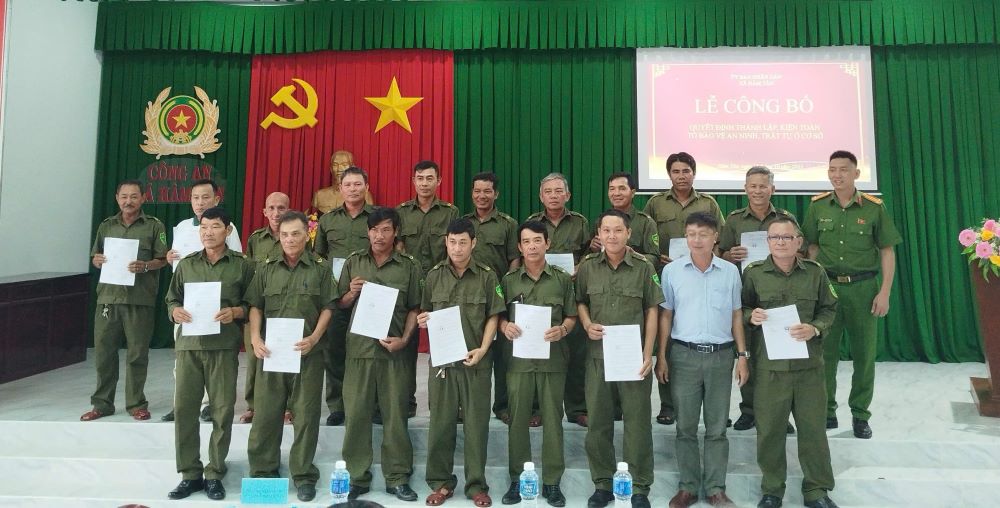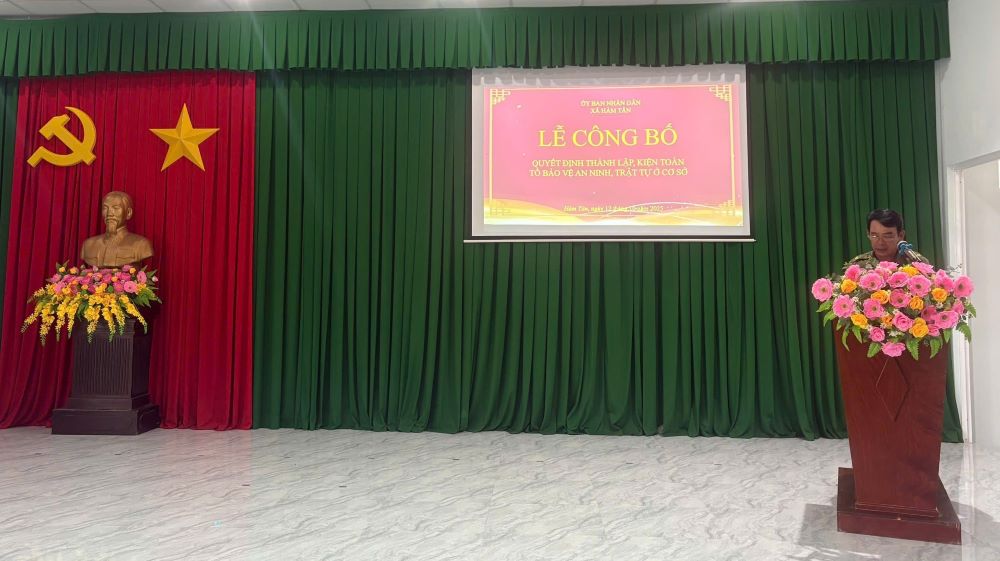 Tại buổi Lễ, đồng chí Nguyễn Phúc Hoàn – Phó Chủ tịch UBND xã Hàm Tân đã công bố và trao Quyết định Thành lập, kiện toàn Tổ bảo vệ an ninh, trật tự cơ sở cho đại diện 17 Tổ ANTT cơ sở xã Hàm Tân.