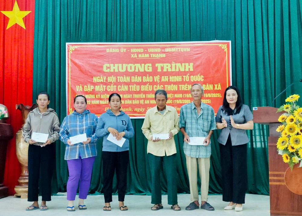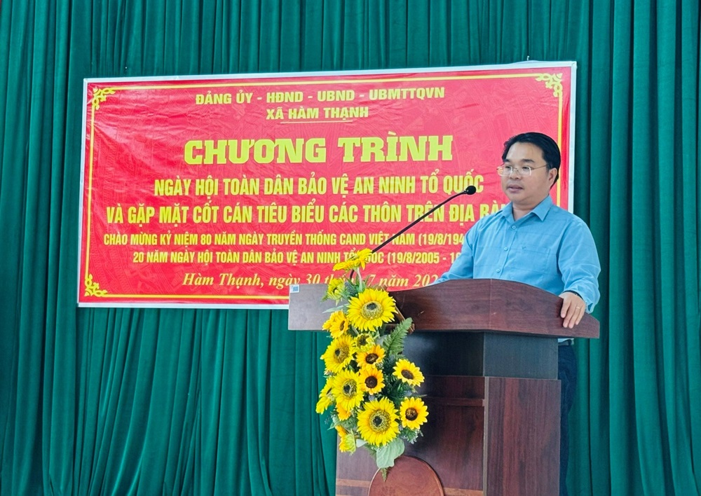 Phát biểu tại buổi lễ, đồng chí Nguyễn Đình Quang - Phó Bí thư Đảng uỷ, Chủ tịch UBND xã nhấn mạnh: Quán triệt quan điểm của Đảng và Bác Hồ kính yêu “Sự nghiệp cách mạng là của nhân dân, do nhân dân và vì nhân dân”; bảo vệ an ninh Tổ quốc cũng là sự nghiệp của toàn dân. Tiếp tục phát huy truyền thống đoàn kết, xã Hàm Thạnh quyết tâm tiếp tục đẩy mạnh phong trào toàn dân bảo vệ Tổ quốc trong tình hình mới.