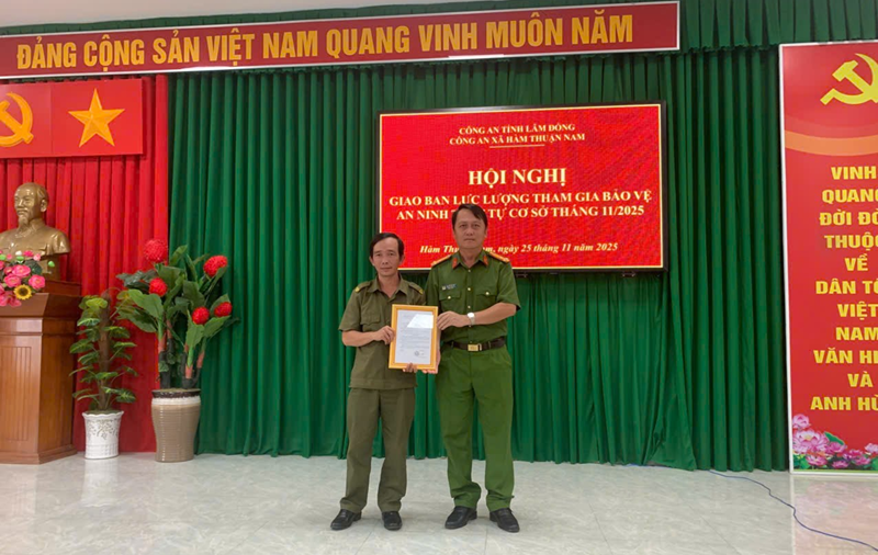 Trong hội nghị, đồng chí Trưởng Công an xã đã trao Quyết định của Chủ tịch UBND xã về việc công nhận thành viên lực lượng tham gia bảo vệ ANTT tại cơ sở đối với 01 đồng chí tại thôn Lập Hòa, theo đề nghị của Công an xã Hàm Thuận Nam.