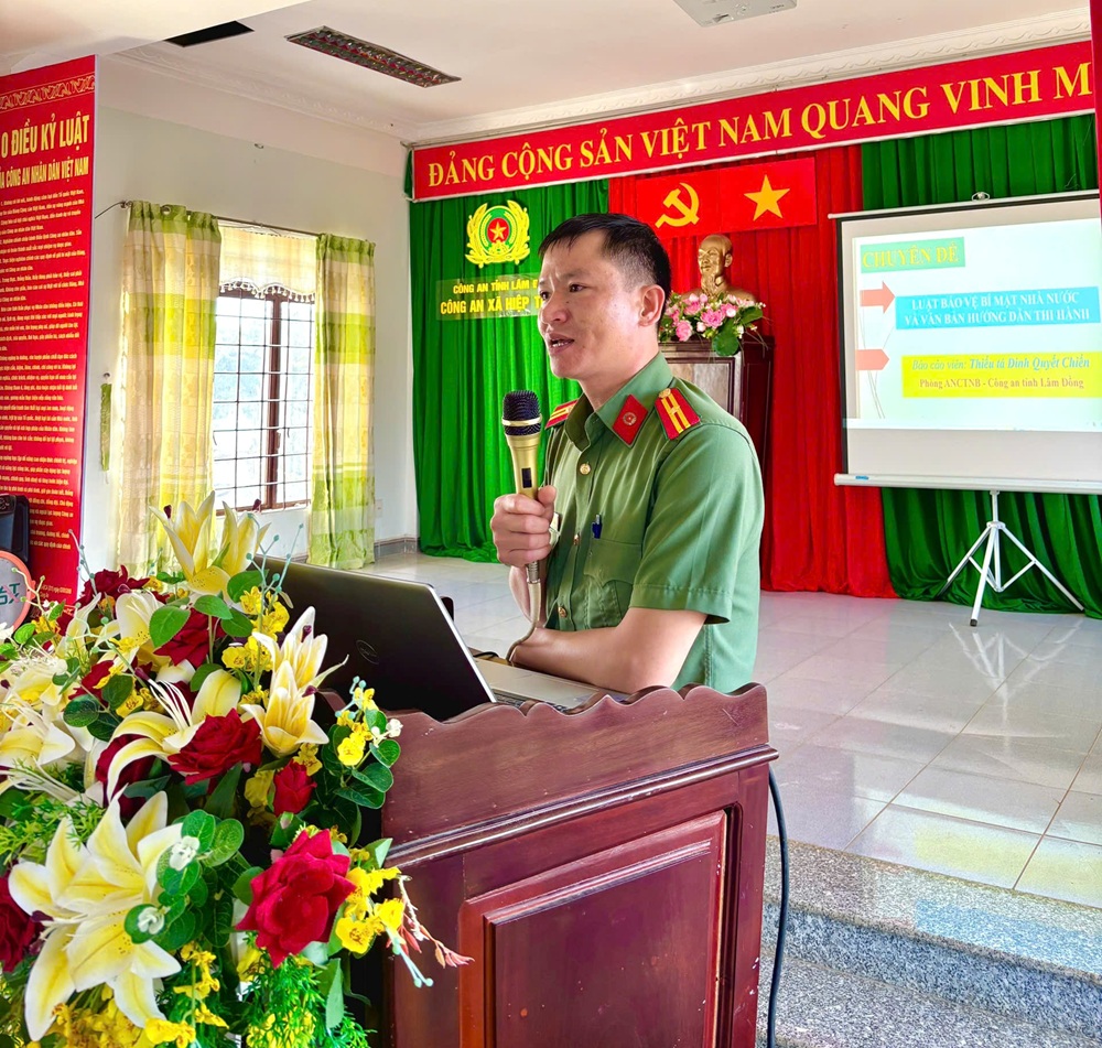 Thiếu tá Đinh Quyết Chiến – cán bộ Phòng An ninh chính trị nội bộ báo cáo chuyên đề Luật bảo vệ bí mật nhà nước và các văn bản thi hành