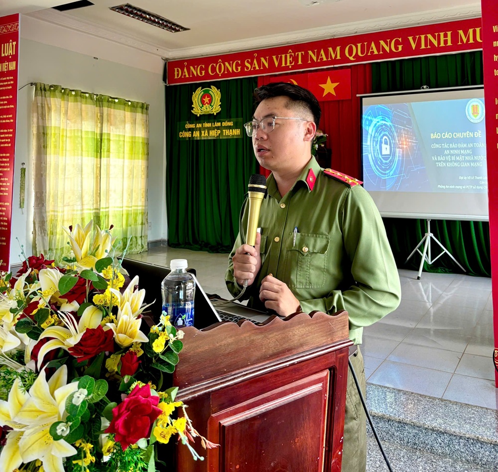 Cũng trong chương trình, Đại úy Võ Lê Thanh Lâm – cán bộ Phòng An ninh mạng và phòng, chống tội phạm sử dụng công nghệ cao đã báo cáo chuyên đề về Công tác bảo đảm an toàn, an ninh mạng và bảo vệ bí mật Nhà nước trên không gian mạng. Nội dung tập trung giới thiệu phương thức, thủ đoạn hoạt động của tội phạm mạng, hướng dẫn cán bộ nhận biết rủi ro, bảo mật tài khoản, mật khẩu và sử dụng thiết bị số an toàn; thực hành kỹ năng bảo vệ dữ liệu, email công vụ và hệ thống thông tin nội bộ.