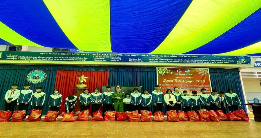 Cuối buổi tuyên truyền, Công an xã Hòa Ninh đã phối hợp với nhà trường trao tặng 50 suất quà cho các em học sinh có hoàn cảnh khó khăn nhân dịp Tết Nguyên đán, thể hiện sự quan tâm, động viên kịp thời đối với các em.