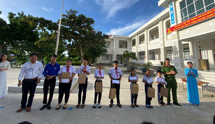 Công an xã Hòa Thắng tặng quà cho học sinh Trường Tiểu học và THCS Hồng Phong