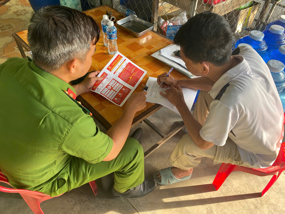 Cán bộ Công an xã tuyên truyền và hướng dẫn cơ sở ký cam kết không vi phạm về vũ khí, vật liệu nổ và pháo