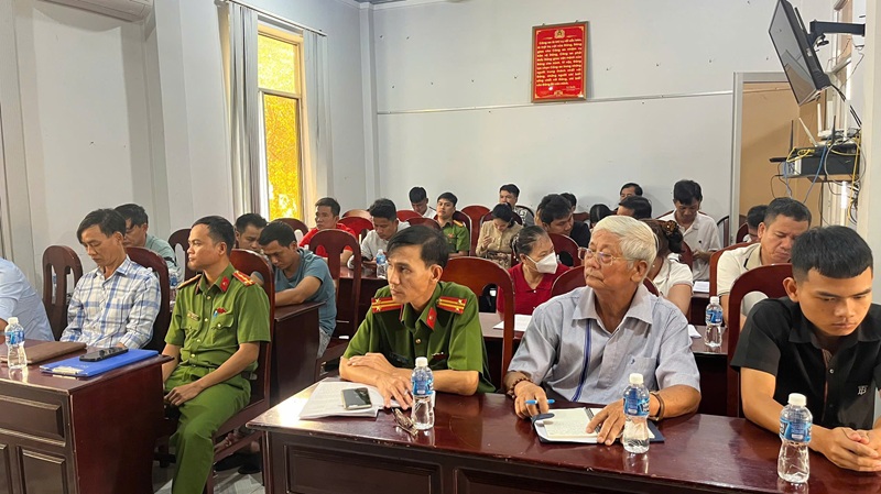 Các chủ cơ sở lắng nghe cán bộ Công an xã tuyên truyền pháp luật