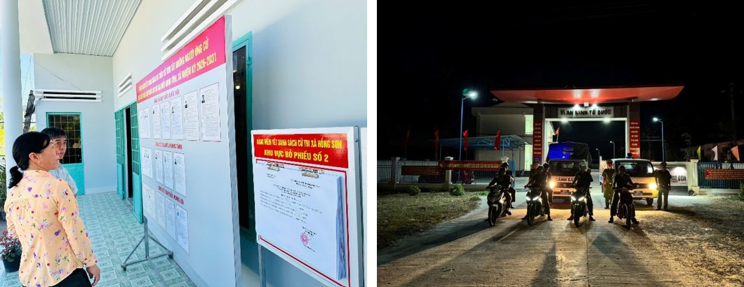 Công an xã tuần tra kiểm soát đảm bảo ANTT và danh sách niêm yết tại các điểm bầu cử