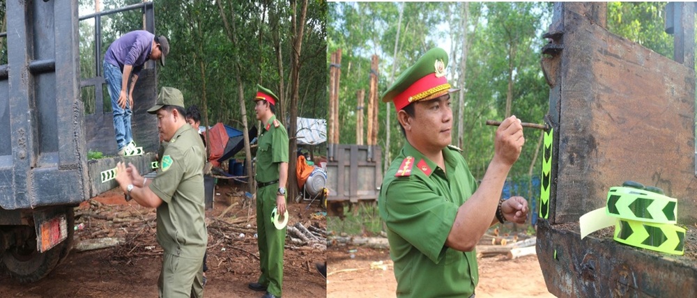 Công an xã và lực lượng tham gia bảo vệ ANTT ở cơ sở dán phản quang cho các xe công nông