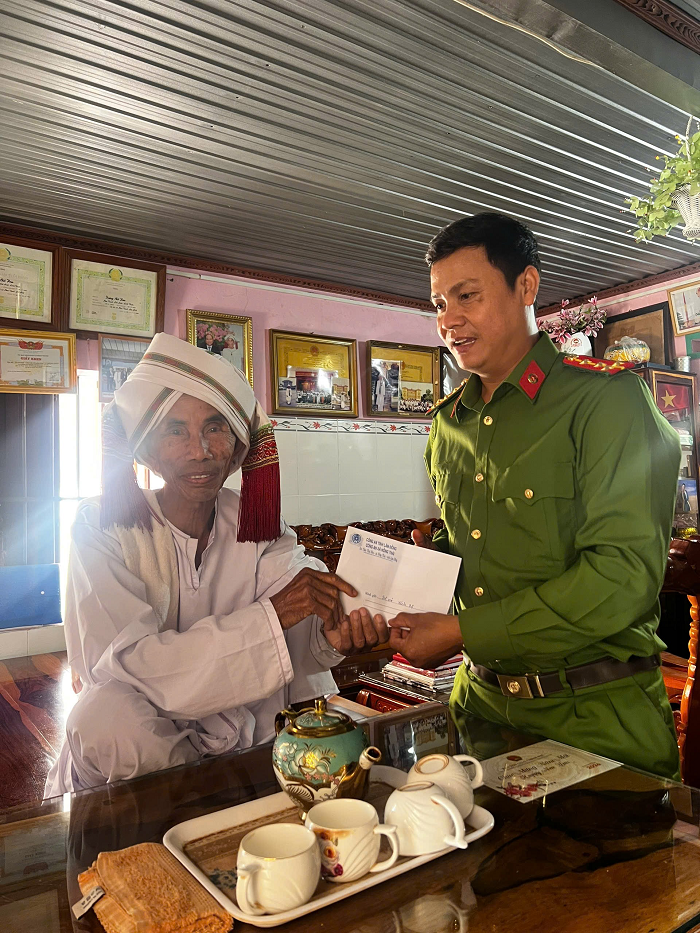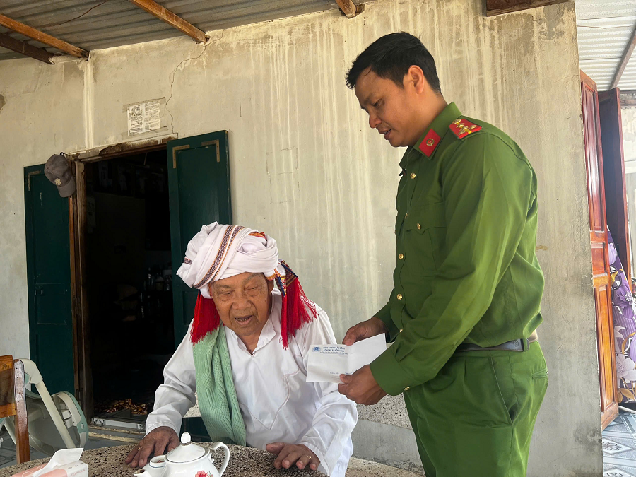 Đại diện Công an xã Hồng Thái thăm hỏi, tặng quà Sư cả Đặng Thi