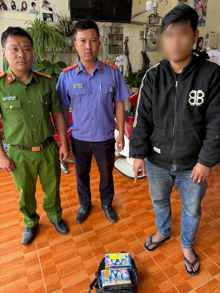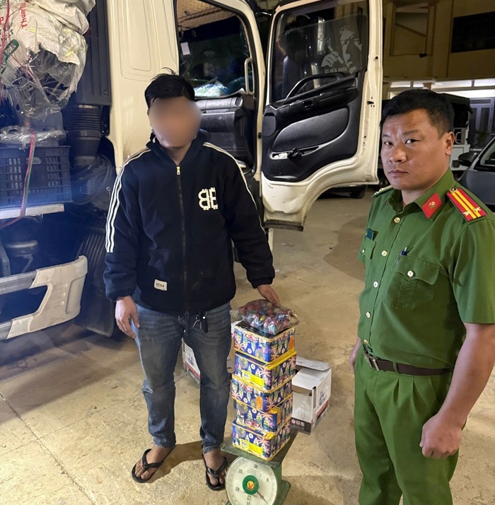 Tại thời điểm kiểm tra, lực lượng chức năng phát hiện trong cabin, sau ghế phụ có 01 túi nilon và 05 hộp pháo hoa nổ. T. khai nhận mua số pháo trên về để sử dụng.