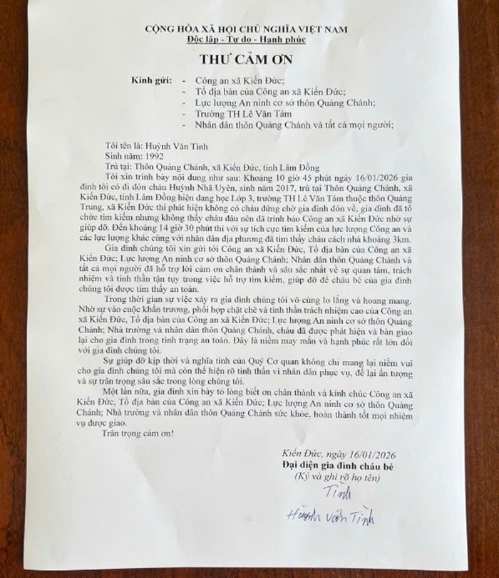 Anh Tình viết thư cảm ơn Công an xã, lực lượng ANTT, nhà trường và Nhân dân
