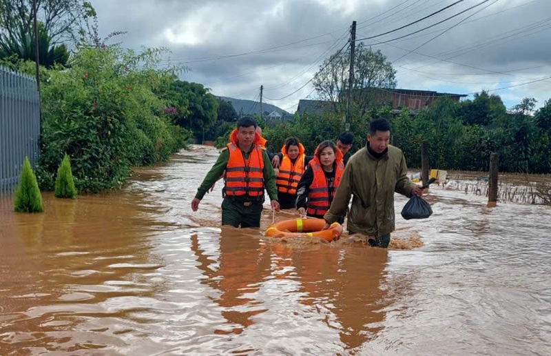 Công an xã Nam Ban Lâm Hà hỗ trợ người dân ra khỏi vùng ngập lụt