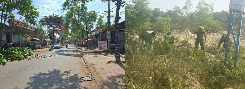 Trước tình hình đó, các lực lượng trên địa bàn xã đã phối hợp, tổ chức phân công lực lượng, phương tiện tiến hành cắt tỉa cây xanh, phát quang bụi rậm, làm thông thoáng hành lang giao thông trên các tuyến đường Quốc lộ 28, DH65 với tổng chiều dài hơn 5 km.