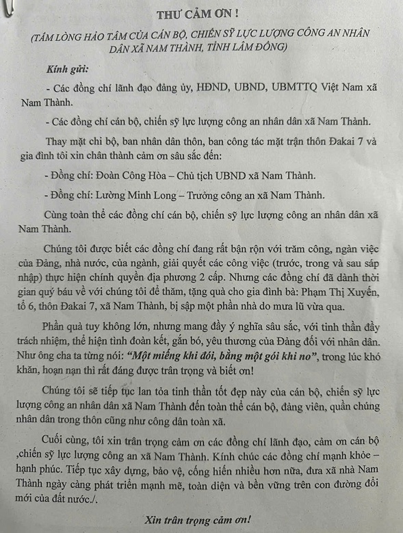 Trân trọng sự quan tâm, hỗ trợ của lực lượng Công an xã, Ban Công tác Mặt trận thôn Đa Kai 7 và gia đình bà Phạm Thị Xuyến đã có thư cảm ơn gửi đến Công an xã Nam Thành.
