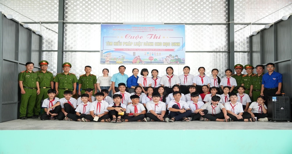 Công an xã Nam Thành cùng giáo viên Trường THCS Lý Tự Trọng, Đoàn TNCS HCM xã và các em học sinh chụp ảnh lưu niệm sau Chương trình