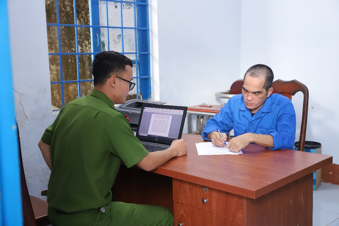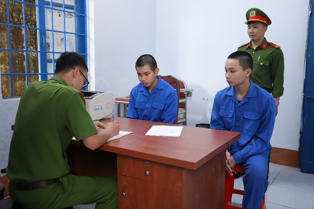 Công an xã Nhân Cơ làm việc với đối tượng Nguyễn Hữu Nam và Lê Nhựt Quang về hành vi lừa đảo chiếm đoạt tài sản