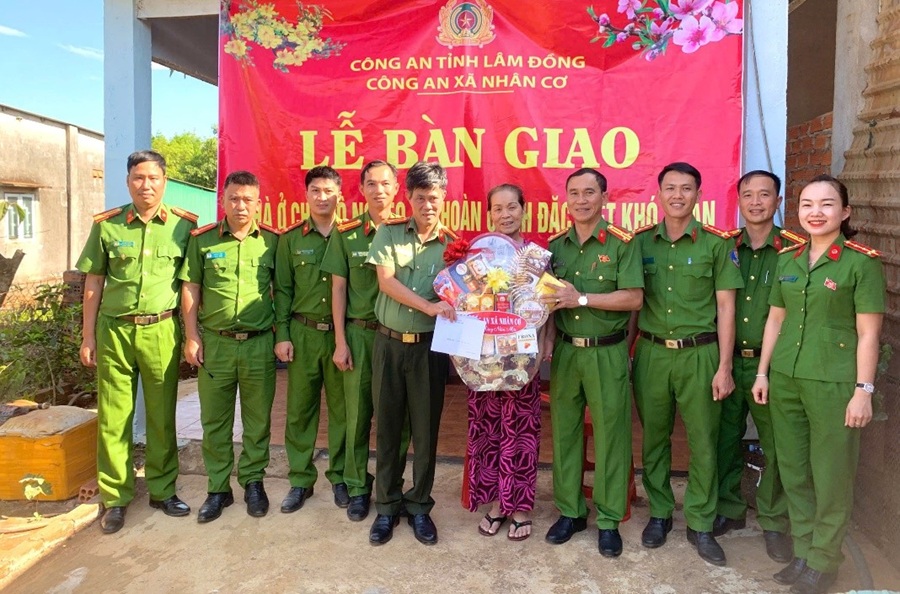 Chỉ huy Công an xã Nhân Cơ dự Lễ bàn giao nhà và trao tặng quà Tết cho hộ dân