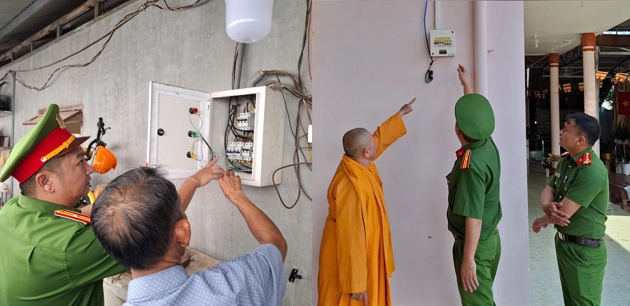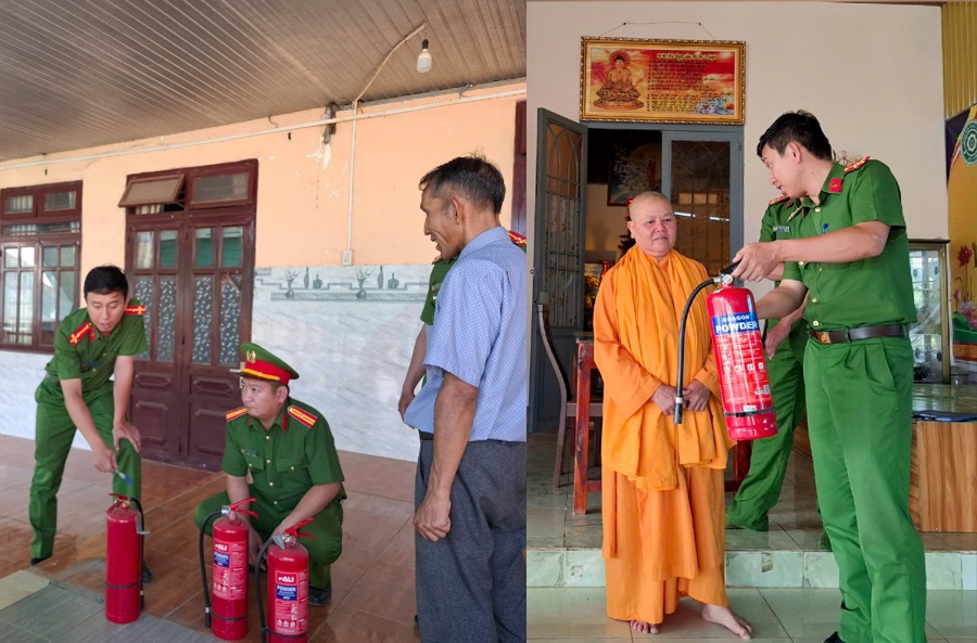 Trong quá trình kiểm tra, cán bộ Công an xã trực tiếp làm việc với người đứng đầu các cơ sở tôn giáo, kiểm tra hệ thống điện, nguồn lửa, trang thiết bị chữa cháy; đồng thời hướng dẫn các biện pháp phòng ngừa cháy nổ và thao tác sử dụng bình chữa cháy xách tay đúng quy định.