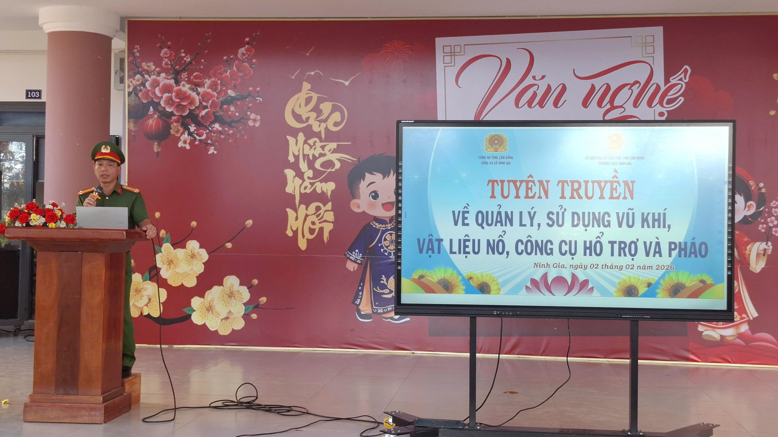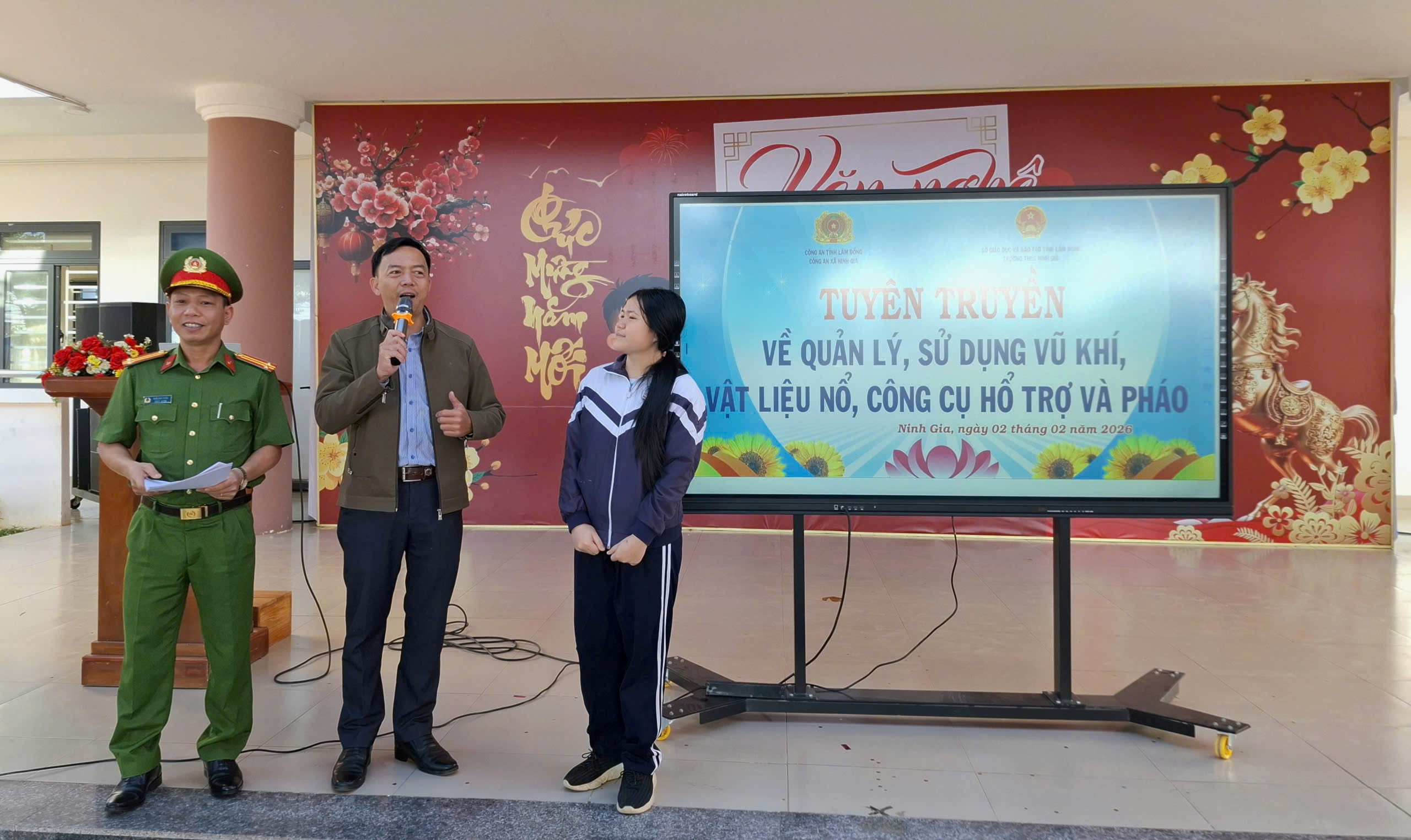 Sau lễ chào cờ đầu tuần, sáng ngày 02/02/2026, tuyên truyền viên Công an xã Ninh Gia đã trực tiếp phổ biến đến toàn thể giáo viên, học sinh Trường THCS Ninh Gia những quy định cơ bản của pháp luật liên quan đến vũ khí, vật liệu nổ, công cụ hỗ trợ và pháo; đồng thời làm rõ các hành vi bị nghiêm cấm và hậu quả pháp lý khi vi phạm.