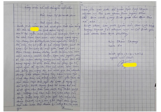Không chỉ trong công tác hỗ trợ Nhân dân, Công an xã Ninh Gia còn đạt kết quả tích cực trong đấu tranh phòng, chống tội phạm. Ngày 02/4/2026, đơn vị nhận được thư cảm ơn của một hộ kinh doanh tại thôn Ninh Thiện.